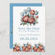 En vackert illustrerad blombukett. Buketen består av stora, vibrerande peonier i terracotta och blå nyanser, kompletterade med mindre blå tulpaner. Det finns också grönt löv och gyllene accenter, som möjligen representerar stammar eller andra blommigt inslag. Blommorna är centralt placerade, och ett par av sammanflätat guldringar är placerat mitt i dem. Hela sammansättningen ställs in mot en vit bakgrund, med tonvikt på färg och detaljer om blommorna.