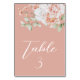 Det här romantiska bröllop-kortet i blommigt har en elegant dammig persikobakgrund med vattenfärgspersikor och vita blommor. En delikat bukett visas på toppen. Ett exempel på bordsnummer skrivs ut nedan i ett elegant-skript.