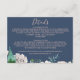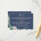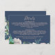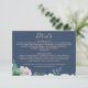 Detta romantiska pionblommor blå bröllopsinformationskort är perfekt för ett elegant bröllop. Den blomsterrika designen har rosafärgade, persikofärgade och vita vattenfärgblommor på en marinblå bakgrund.