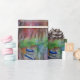 Akvarell-landskap med vacker båtteckning. Rosa, blå, grön - morgonfärger - vacker, romantisk målning. Omslagspapper för alla tillfällen.