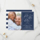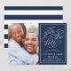 Vårt Romantiska begärandefoto sparar enkelt och elegant datumkortet med förlovningens favoritfoto på den lämnat sidan, med information om bröllop på högerna. "Spara datumet" visas i vit skripttypografi med ett chicens hjärta inarbetat i designen, mot en klassisk marin blå bakgrund. Lägg till information om bröllop, inklusive namn, bröllop, datum, plats och webbplats. Kort tillbaka till det moderna vågrät rand i marinen och vitt.
