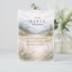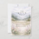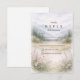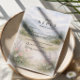 En lugn och stämningsfull design inspirerad av dimmiga bergslandskap och tysta skogsmiljöer. Mjuka akvarellskikt av tallar och avlägsna kullar tonar försiktigt in i bakgrunden och skapar djup och en lugn, romantisk stämning. Den dämpade paletten av salvia grön, sval grå och mjuk elfenben ger designen en raffinerad, naturdriven elegans – perfekt för par som dras till minimalistisk estetik och intima utomhusfiranden.