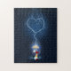 Denna bildkonst som bildligt nog är träffande visar ett ungt par som har slagits av hjärtformade belysning samtidigt som man delar ett paraply i en åskstorm - en originalillustration som gjordes i januari 2023.