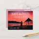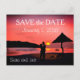 Ett vykort "spara datumet" med ett kärleksfullt par på stranden vid solnedgången.