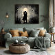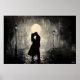En romantisk svart-vit konst som skildrar ett par som kramas under månljuset på en tyst, regnblöt gata. Denna minimalistiska, filmiska scen fångar intimitet, tystnaden och den känslomässiga kopplingen, vilket gör den idealisk för eleganta interiörer och tidlös romantisk väggdekor.