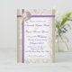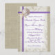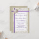 Det tryckta utseendet av spets över burlap strandbröllopsinbjudan. Accenterad i lila med en sjöstjärna och sanddollar.