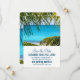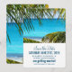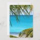 Ett bröllop sparar datum platt kort med en vacker bild av en turkos tropisk strand med stora gröna palmblad som ramar in scenen.