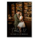 Det här bröllopsbordskortet visar en romantisk scen från en elegant bar, med två personer som varmt omfamnar varandra. Designen visar en välfylld bar upplyst av mjuk belysning, vilket skapar en mysig och inbjudande atmosfär. Färgpaletten omfattar varma nyanser av djupa bruna och bärnstensfärgade toner, som kontrasteras av parets ljusare klädsel. Typografin längst ner framhäver "Bord 12" i ett flödande kursivt skrivsätt, vilket ger den totala layouten en touch av sofistikation. Perfekt för att skapa stämning på din speciella fest, kombinerar detta kort romantik och elegans sömlöst.