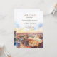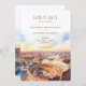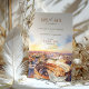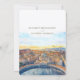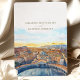 Med den här eleganten "Spara datumet" firar du ditt kommande bröllop med en vattenfärgsvy av Rom, Italien. I fronten visas en vackert illustrerad flygvy över det ikoniska kolosseum som bantas i varma skuggor av gyllene gult, terracotta och mjuka blå himmel, och som fångar den eviga stadens tidlösa allure. Med sofistikerad typografi och en drömmande, konstnärlig beröring är inbjudan perfekt för par att planera ett destinationsbröllop i Rom. Ange tonen för ett romantiskt italienskt firande med den här oförglömliga designen.