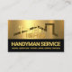 En guld och en svart kolonn lagrar accentueras av ett motiv för kreativet guld handyman verktyg med en taktopp i bakgrunden. Svarta lagrar har den överdimensionerade affärsverksamheten "HANDYMAN SERVICE" i namn och den typ av tjänst som erbjuds precis under. ; Ändra tjänstlistan till kostym till ditt eget servicebehov. På andra sidan, i ett svart täcke, ligger en logotyp i guld i hemlandskapet som du kan använda på högst upp. Detta följs av ditt namn, din kontaktinformation och ett sloganalternativ för att publicera dina tjänster. Alla bokstäver är i Faux guld. Ett kort för underbar professionell för byggnads- och handyman. #handyman #building #building-entreprenör #homerepair #entreprenör