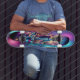 Den här vibrerande designen har en coola-DJ-katt i hjärtat av en tak-party, som ställs in mot bakgrunden av en stadskylin på natten. Genom att ha hörlurar och säkert blanda slag förkroppsligar katten sammanslagningen av stadens nattliv och den bakåtriktade coola som definierar "Coola Cat Collection". Färgt ljus, dans figurer och nyare accenter ger liv åt den livliga party-atmosfären, skapar denna skateboard en must-have för musik älskare, skateboard entusiaster och kattamirers i lika grad.