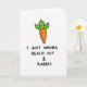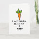 This greeting card features a simple white background with a stylized orange carrot centered near the top, outlined in black and topped with jagged green leaves that feel fresh and friendly 🌷. The carrot’s slightly curved shape and tidy outline give it a light, approachable look, like a small gesture meant to get someone’s attention in a sweet way. Beneath the illustration, the message is stacked in three centered lines in rounded black lettering, reading “I JUST WANNA REACH OUT & RABBIT,” with the ampersand tucked neatly into the middle line. The pun pairs the carrot with a bunny idea 🐰, turning the scene into a flirty nudge that could also read like a warm note between close friends. Plenty of open white space surrounds the art and text, so the orange and green stand out without crowding the page. The contrast of black outlines and black text keeps everything easy to read while still feeling casual and modern. The top half is dominated by the carrot graphic, and the lower half is anchored by the centered black phrase beneath it.