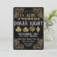 Den här glamorösa inbjudan till pokerkvällspartiet i anpassningsbar innehåller ett Underbart Gatsby-roamingtema på 20 sekunder. Uttrycket "Roaring Twenties" är skrivet i ett 1920-tal-vintage Broadway stil med ett faux guld-folie i mönster. Ram i inbjudan har samma dekorativa hörn som guld Art Deco stil. Bakgrunden är en solid svart färg. Mittkortssymbolerna för pokerspel skrivs ut i ett guld glitter stil över mitten.