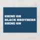 Detta afrikanska amerikanska vykort för motiv i Manar har "Shine on Black Brothers Shine On" skrivet i vitt på blå bakgrund. Detta positiva och upplyftande budskap om psykisk hälsa riktar sig till svarta manar och pojkar och ger en positiv inställning var man än går. Ett uppmuntrande och inspirerande budskap att sända till era nära och kära.