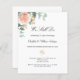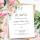 En chic vit bakgrund dekorerad med en roséguld- och rosapink floral, rosenblomma och gröna akvarellmålade eukalyptusblad, kvistar, grönska och en falsk guldkvist. Anpassa med era namn och detaljer. Svarta och gröna bokstäver.