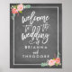 Välkommen till bröllopet affisch med svart tavla bakgrund och målade rosor.