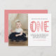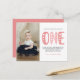 Modern, enkel och elegant flicka första födelsedagstack för vykortet. Utformning med rosa typografi ett, tack vare meddelande och foto.