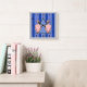 Denna klassiska Art Deco Cat Clock-design får nytt liv av den digitala konstnären Leslie Sigal Javorek. Sätt på en strimlad (royal blå, kornblomma och silver) bakgrund med bra läder, är en mittmedaljon med ett par rosa egyptiska geometriska katter som flankerar en handdukande blå pyramid som imiterar bakelitens (en tidigt-plast) utseende.
