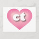 Det här vykortet har ett rosa hjärta med ett vitt tvättat centrum som innehåller fet, rundad, vit nedre brev ct från fodral, en lekfull version av förkortningen för Connecticut, författningstillståndet. Kortets baksida är tom och väntar på dina handskrivna känslor eller anpassade texter.