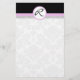Ett muterat Damask-mönster täcker hela bakgrunden för den här eleganten. Toppad med en tjock svart linje, ett rosa band med ett monogram inuti en cirkel. Finns även i andra färg. Idealisk för formella skrivningar från brev eller brev vid särskilda tillfällen.
