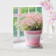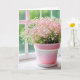 Rosa baby utandningsluft i rosa potten genom ett soligt fönster för att tänka på dig. Text kan ändras.