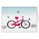 En söt utformning med en rosa cykel med säte och ram, svarta pedaler och svart däck. En mjuk blå bakgrund med små blå fjärilar som flyger om.