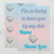 Denna eleganta valentinshälsningskort har en mjuk pastellrosa och blå övergångsgradient som bakgrund, accentuerad med glittrande 3D-silverglitterhjärtan. Designad för moderna par, visar framsidan ett romantiskt "Jag är så lycklig att jag har dig"-meddelande i stilfull typografi. Denna anpassningsbara brevpapper tillåter dig att lägga till mottagarens och avsändarens namn, vilket gör det till en unik souvenir. Baksidan har ett matchande mönster av flytande metalliska hjärtan på en gnistrande estetisk bakgrund. Perfekt för pojkvänner, flickvänner eller makar som uppskattar en modern "ren flicka" eller "mjuk pojke" estetik. Högkvalitativ utskrift på begäran säkerställer levande färger och skarpa detaljer