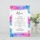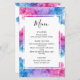 En matmeny för en baby kön avslöjande fest. På en vit bakgrund består designen av elegant blå och rosa rök som bryter ut. Inom en vit ram, innehåller texten förrätt, huvudrätt och efterrätt på meny. På baksidan visas barnets efternamn inom fallande blå och rosa rök, följt av kön avslöjande, datum för evenemanget eller förväntad födseldatum, och parets namn.