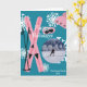 Rosa skidutrustning, mössa & skyddsbrillor med snöflingor på ett vackert blått julkort. Perfekt för julen.