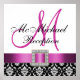 Anpassadets bröllopsmottagningsskylt Poster. Den här vackra bröllopsmottagningsskylten är tryckt med ett svart och vitt Damaskmönster och ett foto av ett band av rosa satin med en fyrkantig diamantbrosch. Anpassa med ditt namn och ditt monogram först. Layout Design av Elke Clarke. Grafik licensierad. Allt är perfekt och planerad till perfektion, och sedan ser man att någon har skrivit ett tecken för att föra folk till mottagningshallen. Varför inte använda den här eleganten poster? Du kan lägga till din egen bröllopsmottagningsinformation till den här designen för att se till att dina gäster har all information de behöver.