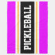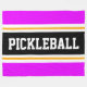 Den här sportetiska, atletiska designen har fet PICKLEBALL-text inuti ett markerat svart rand med dubbla vit och gult tävla ränder mot ljusa yttre ränder av rosa. Texten i den här designen kan vara personlig.
