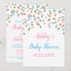 Anpassad text könsneutral eller pojke och flicka tvillingar baby shower inbjudan i ljusblå, rosa och guld konfetti mönster. Observera att konfetti är endast en fotografisk effekt.