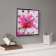 Söt blomma med rosa petaler som exploderar i rosa stänk på en stor vit vägg bakom. Stora droppar av målarfärg sprutas och bryts överallt. Utformning av Coolans moderna abstrakt contemporary.