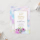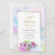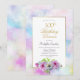 En blå och rosa blommig 100-årsfirande middagsinbjudan med en guldbord och pastellfärgad akvarellkant.