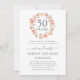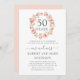 En söt och elegant krans av rosa blommor omger 50 år för att kröna denna inbjudan till 50-års bröllopsdag. Texten är en kombination av modern kalligrafi och klassisk upprätt text. Den grå färgen kompletterar de mjuka rosa blommorna