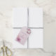 Mycket vacker blekrosa etikett med spetseffekt och arrangemang av rosa och plommonfärgade blommor.