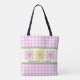 Uppdatera din vår- eller sommarskåp med denna färgglada shoppingväska som har vackra rosa och gula blommor, ett klassiskt gingham-mönster, trendiga kanter med bågskärning, lekfulla prickar och ett anpassningsbart monogram. Ändra namnet för att skapa en unik present som passar lika bra för flickor, tonåringar och kvinnor. Oavsett om den används för en dag ute med vänner eller en helgutflykt, kommer denna mångsidiga väska att lägga till en personlig touch av färg till vilken vår- eller sommaroutfit som helst.