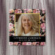 Firande på begravningsknappen på livets fyrkantiga begravning med en snyggt svart bakgrund, elegant vattenfärgblommor i rosan, ett foto av din älskade i ett faux guld ram, deras namn och födelse/död data.