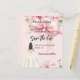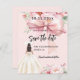 En rosa med elegant, dekorerad med stor rosa, rosa blommor och en flicka i en färgad av kräm. Anpassa och lägg till namn och detaljer. 1 lakan = 1 inbjudan tryckt kant till kant.