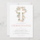 En elegant som döper inbjudan till dig med en liten flicka med söt rosa blommor och grönt löv bakom ett vitt kor. Anpassa med dina uppgifter om rosa och grått.