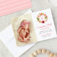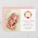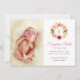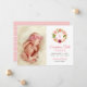 Med det här snyggten introducerar du ditt söta flicka med ett nyfött foto intill en vattenfärgad andedräkt med anpassningsbar monogram som inledningsvis är inramat av en krans av grönt med pastellblommor, och persikodahlia- och ro-blommor. Den elegant rosa--penseltexten kan vara personlig med baby namn, och mörkens varma grått-text kan anpassas med alla viktiga födelsestatistik. En samordnande mönster i rosa och vitt vågrät rand går bakåt på kortet.