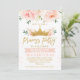 Rosa blommigt och guld glitter prinsessan party fick födelsedagsinbjudan till en liten flicka. Den här designen har en faux-kalligrafrubrik i guld och krona- och rosa-punkter och rosa-blommigt. En söt inbjudan till en prinsessa födelsedagsfest.