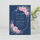 Denna djärva och visuella utformning i bröllop kombinerar handmålade blommor och löv av rosa med modernt geometriskt ram mot mörk blått bakgrund. Brides och Grooms monogram och en söt blommigt ram på baksidan. Det är perfekt för vinterbröllopet, marinen och rosan bröllop. Fet färg: mörk blått, rosa, gult, orange, blått, lila, grönt.