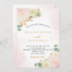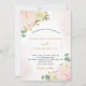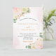 En vit bakgrund med mjuk rosa och ro guld-vattenfärgspenseldrag i bakgrunden. Dekorerad med vattenfärgade blommor, blommigt rosa ros, vita orkidéer och gult gerbera, eukalyptus greenery och faux guld sprigs. Anpassa och lägg till information om namn och bröllop. Svart och guldfärgad färgad brev.