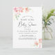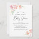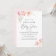 Denna vackra och stilrena babyflicka shower-inbjudan har impressionistiska akvarellblommor i rosa och korall med guldaccent och "Baby Shower" skriven i ett stilrent modernt skrivstil.