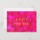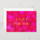 Presentkort med ord "A Gift for You" i faux guld mot rosa bokeh ljus mönster på framsidan. Anpassa det här kortet med dina uppgifter genom att ersätta platshållartexten. Om du vill ha fler alternativ, t.ex. att ändra teckensnitt, storlek text / färg eller mellanrummet mellan brev, klickar du på knappen "Anpassa". *Observera att Zazzle Watermark som visas i zoomförhandsvisningen INTE visas på den färdiga tryckta produkten. © Rosewood and Citrus