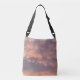 Bilden på den här Crossbody Tote Bag är ett originalfoto av ZoeSPEAK, som tas en kväll som sol-uppsättning. Molnerna ser ut som puffig bollar av bomull, hela rosan mot bakgrund av sol. Till och med blå himmel har en rosaftig ton. En aning gult toner molnbandet närmare sol.