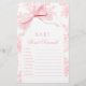 Elegant och sofistikerat "Baby ord-scramble"-spel, designat för en Coquette-temed flicka dusch. Den här klassiska rosan har en charmerande, handdragen butik på bohemisk båge och rosa blommigt vintage mönster längst bak och tillför en aning tidlös stil och roligt till din händelse. Perfekt för att roa gäster och skapa omhuldade minnen, det är ett perfekt tillskott till en söt och aptitlig babydusch firande. Svar: 1. diaper 2. rattle 3. nappar 4. formel 5. gravid 7. barnvagn 8. bilsäte 9. flaska 10. daghem