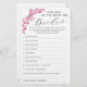 Det här möhippa-spelkortet är Hur väl känner du Bride? Det har tio frågor till spelare att besvara. Utformningen har en chic silke-rosa-båge med faux-rhinestoner. Anpassa kortens baksida med bridens namn. Matchande produkter är tillgängliga.