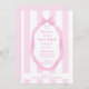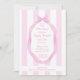 Fira flicka med denna inbjudan till rosa och vit babydusch. En rosa båge och ett band omger inbjudningsinformationen, medan bakgrunden består av rosa och vitt rand. Kortets baksida är rosa.